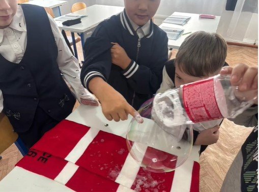 Балалар теориялық материалмен танысып қана қоймай, сабын көпіршіктерін жасау бойынша қызықты тәжірибе өткізді. Оқушылар қарапайым заттардан жарқын және әуе нәтижесін қалай алуға болатындығын қызығушылықпен байқады.